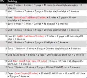 The other key component is getting your nutrition right because its under stress that things start coming undone – especially dehydration, cramps and nausea. I nearly blew the Quad via nausea by taking watermelon with salt at the first Stinson Beach turnaround because they had no potatoes. So use the trail races – about 1/month to work out what works (and, more importantly, what doesn’t).