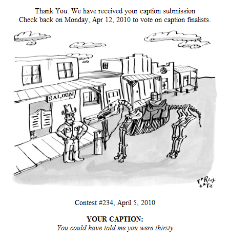 Since reviewing Dan Pink’s A Whole New Mind, I’ve been waiting for an opportunity to enter the New Yorker’s Cartoon Caption Contest. (See my review of the Play section here).