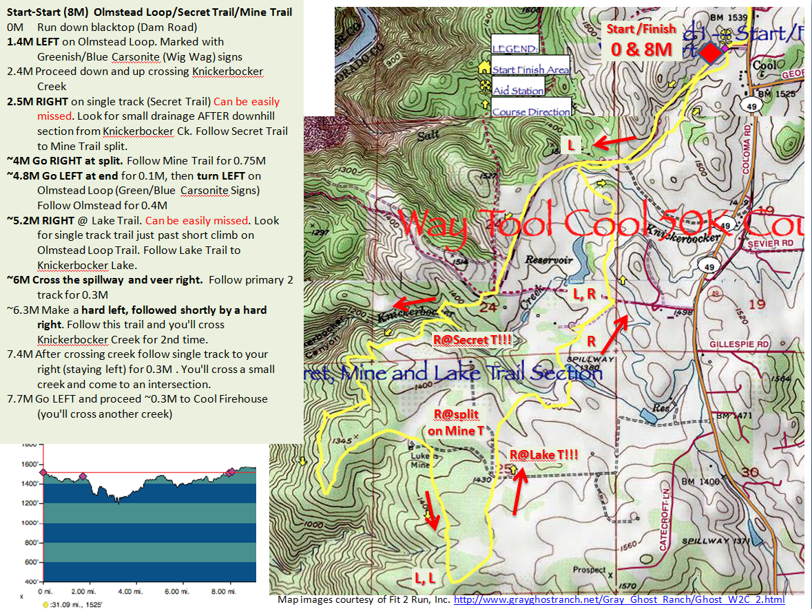 I’m one of the lucky ones who got into Way too Cool 50K next Saturday. The official course map I found hard to read, and a little annoying in the way it was cut up. Personally, I like to see course elevation, directions and distance between aid stations all on one page.